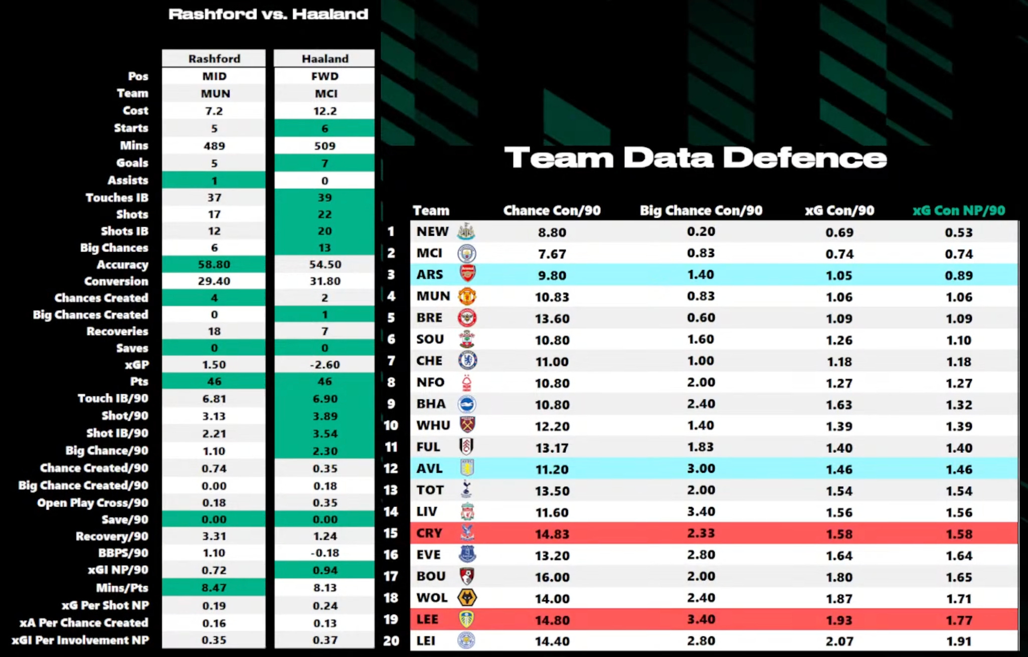 There’s a big opportunity to use your Triple Captain chip over the next two weeks. It’s basically “stats vs fixtures”. This week, Rashford has Crystal Palace and Leeds at home. Next week, Haaland has Aston Villa at home and Arsenal away. A tough choice - they both look unstoppable at the mo. A great data table below from the FPL BlackBox YouTube channel to help you decide.