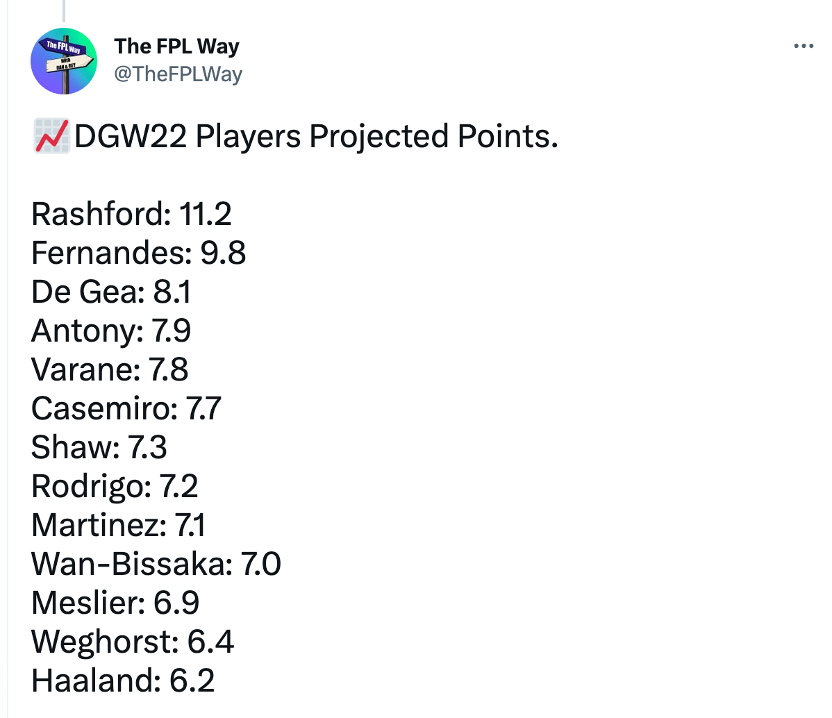 It’s a big two weeks in FPL ahead. Man Utd (and Leeds) have a Double Gameweek this week. Arsenal and Man City have a Double Gameweek next week - so have a plan covering the two weeks and judge your performance after that. The fixtures are below - an obvious takeaway for me is that Arsenal play Everton this week, before a Double next - so it makes sense to bring one in this week if there’s no Man Utd players you need.