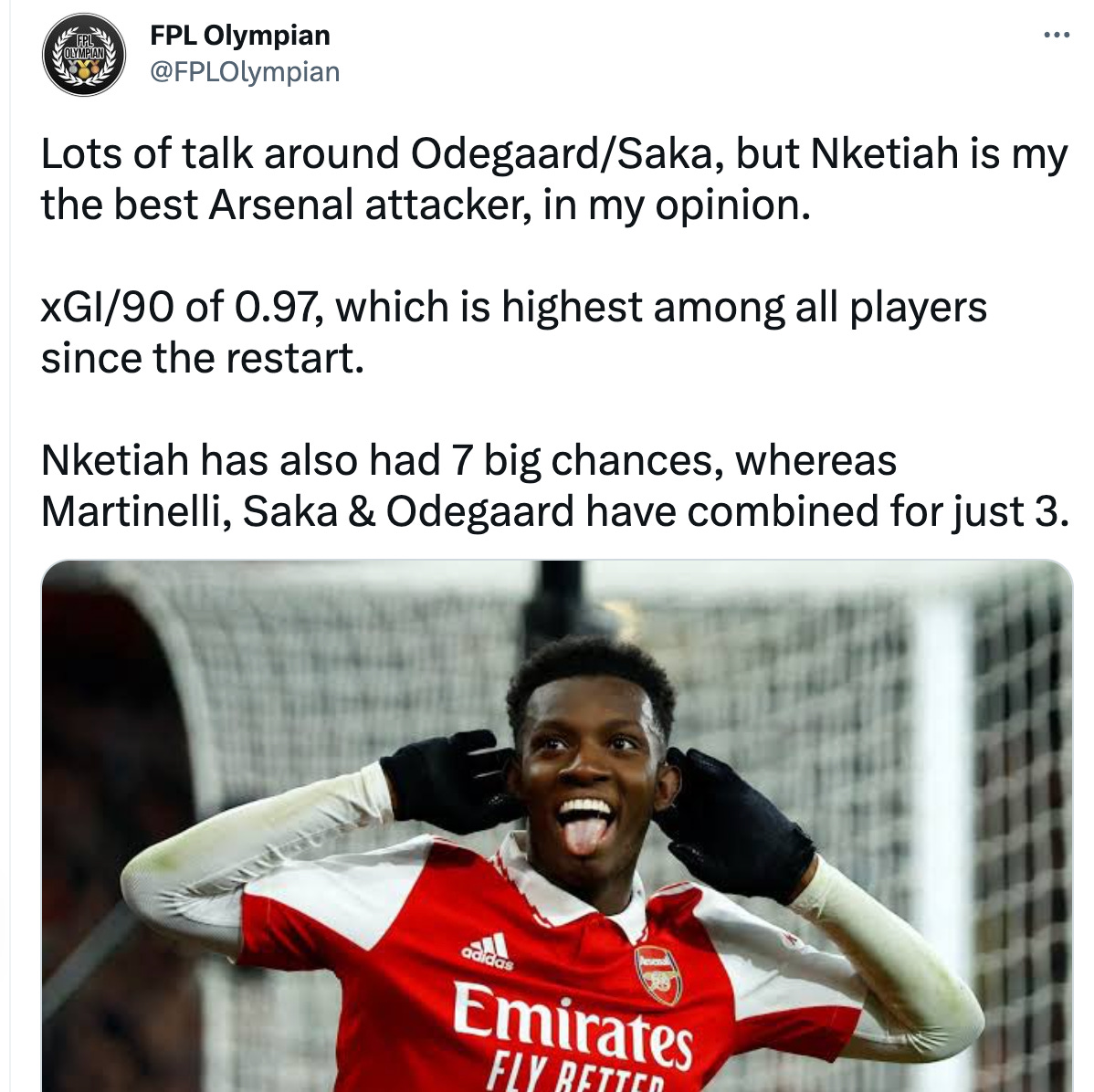 I don’t recommend Wildcarding yet - there will be better weeks to target. But if I were, I think three Arsenal attackers is the way to go. Trossard will hit Martinelli’s minutes a bit. Saka and Odegaard remain the main guys - and Nketiah would be my third Arsenal player. He’s been a great punt for those who went for him early on.