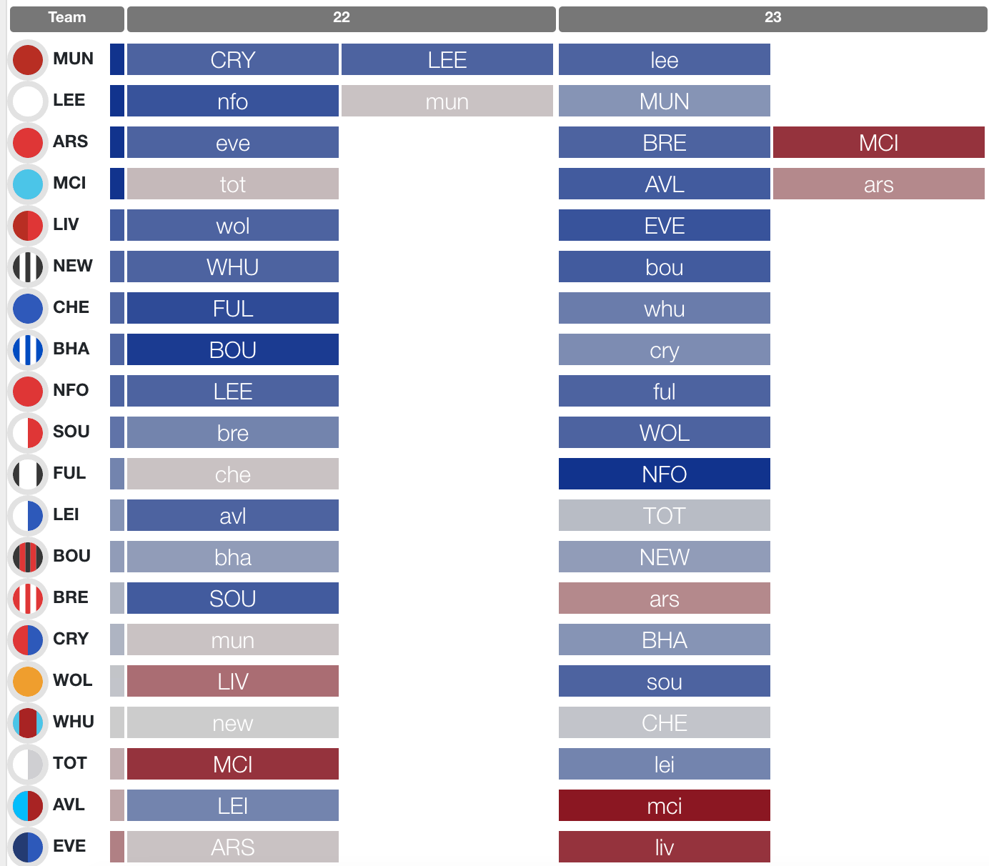 Everton this week for Arsenal, then their Double next week is Brentford and Man City. They also don’t Blank in Gameweek 25, and have a more predictable line-up than Man City - so they are the dream FPL side for the moment.